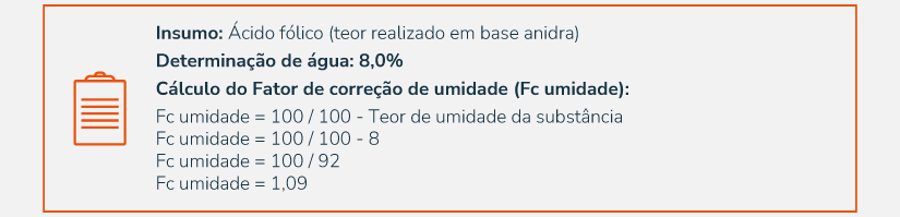 Umas das características físicas dos insumos farmacêuticos é a presença de água em suas moléculas. Seja ela livre ou cristalina. Uma vez que a água livre não faz parte da molécula - é uma característica física do insumo trazer água após a sua síntese - esta muitas vezes vem impregnada na molécula e, comumente, necessita ser corrigida, pois uma parte da massa do insumo não é de moléculas do ativo, mas sim água. Portanto, insumos que apresentarem teor de umidade significativo podem implicar em fatores de correção significativos tornando-se geralmente recomendável à correção da água. Contudo, é válido ressaltar que não existe protocolo ou regra definida sobre quando corrigir umidades provenientes de água livre (não cristalizada). 1-3
