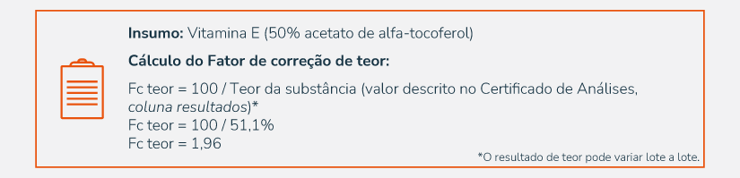 Os fatores de correção são utilizados para ajustar a quantidade de princípio ativo em uma formulação farmacêutica. Eles corrigem a diluição de uma substância, o teor do princípio ativo, o teor elementar de um mineral e/ou a umidade. A aplicação desses fatores depende da avaliação da prescrição médica, dos resultados descritos no certificado de análise (documento que acompanha todas as matérias-primas e detalha as análises feitas e seus resultados, para cada lote do insumo) e das referências técnicas reconhecidas.1-3