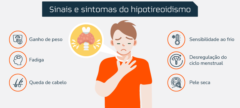 O hipotireoidismo é caracterizado por uma diminuição na taxa metabólica do organismo, que se manifesta a partir de sinais e sintomas como ganho de peso, fadiga, queda de cabelo, sensibilidade ao frio, desregulação do ciclo menstrual, pele seca, entre outros. Imagem adaptada de www.shutterstock.com, 2025.