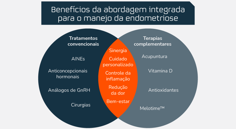 Considerando que até 59% das pacientes não alcançam alívio completo da dor apenas com as terapias convencionais e que esses tratamentos possuem uma série de efeitos adversos – como náuseas, cefaleia, alterações de humor, aumento do risco de trombose, perda de massa óssea e irritação gástrica –, é comum a busca por abordagens complementares que auxiliem a atenuar os sintomas e melhorar a qualidade de vida das pacientes. Terapias como acupuntura e o uso de suplementos têm sido cada vez mais exploradas como formas de reduzir a dor, controlar a inflamação e promover o bem-estar. Embora essas estratégias não substituam as abordagens tradicionais, elas podem atuar em sinergia, proporcionando um cuidado mais abrangente e personalizado. 2,8,9