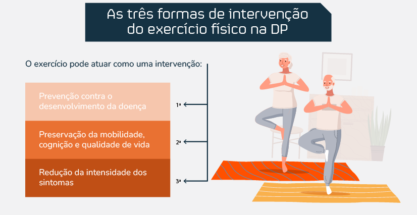 O exercício físico pode atuar tanto não somente como uma medida de proteção contra o desenvolvimento da DP (intervenção primária), como também como uma terapia complementar capaz de influenciar o curso da doença (intervenção secundária) e aliviar seus sintomas (intervenção terciária). Imagem adaptada de www.shutterstock.com, 2025.