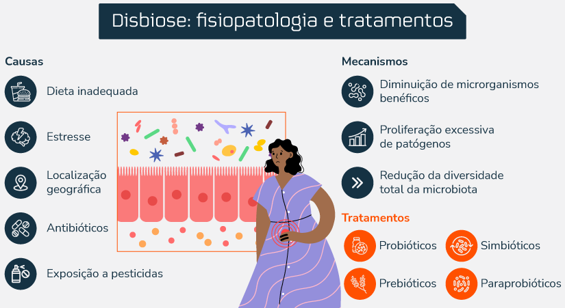 Alguns fatores podem causar alterações no balanço da composição, função ou distribuição da microbiota, dando origem ao que chamamos de disbiose. As principais causas desse desequilíbrio incluem mudanças nos hábitos alimentares, estresse psicológico, localização geográfica, uso indiscriminado de antibióticos e exposição a pesticidas. 7