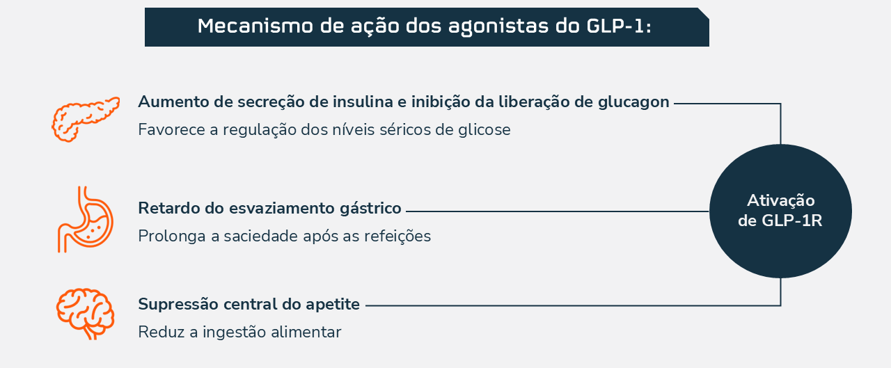 Os agonistas do GLP-1 se destacam por mimetizarem a ação do GLP-1 endógeno, ativando o receptor GLP-1R e promovendo uma série de efeitos fisiológicos, como o aumento da secreção de insulina estimulada pela glicose, a inibição da liberação de glucagon, o retardo no esvaziamento gástrico e a redução da ingestão alimentar a partir da supressão central do apetite.