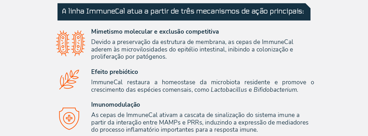 As cepas de ImmuneCal atuam no organismo a partir de três mecanismos principais, sendo eles: mimetismo molecular e exclusão competitiva, efeito prebiótico e imunomodulação por MAMPs.
